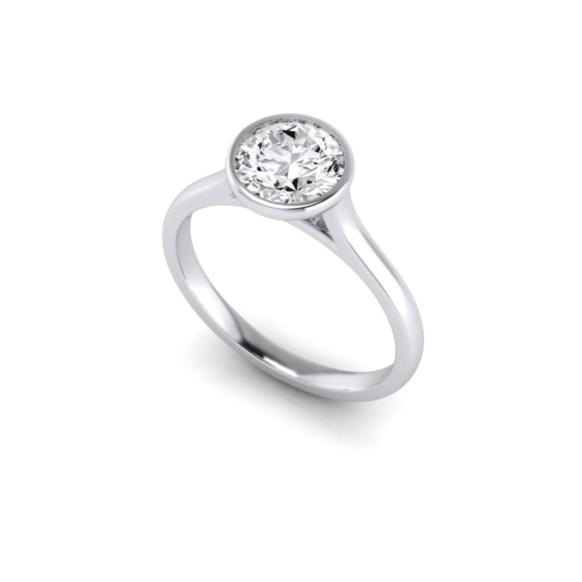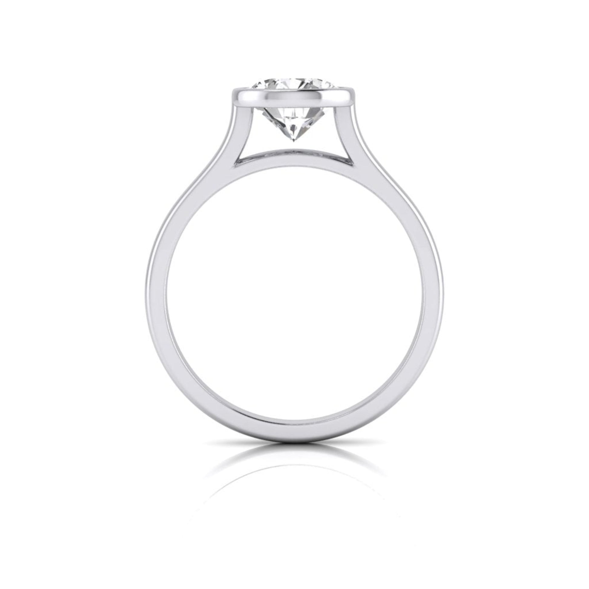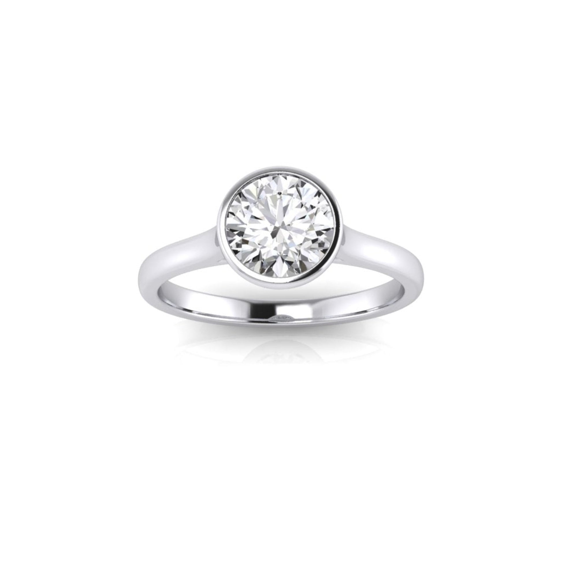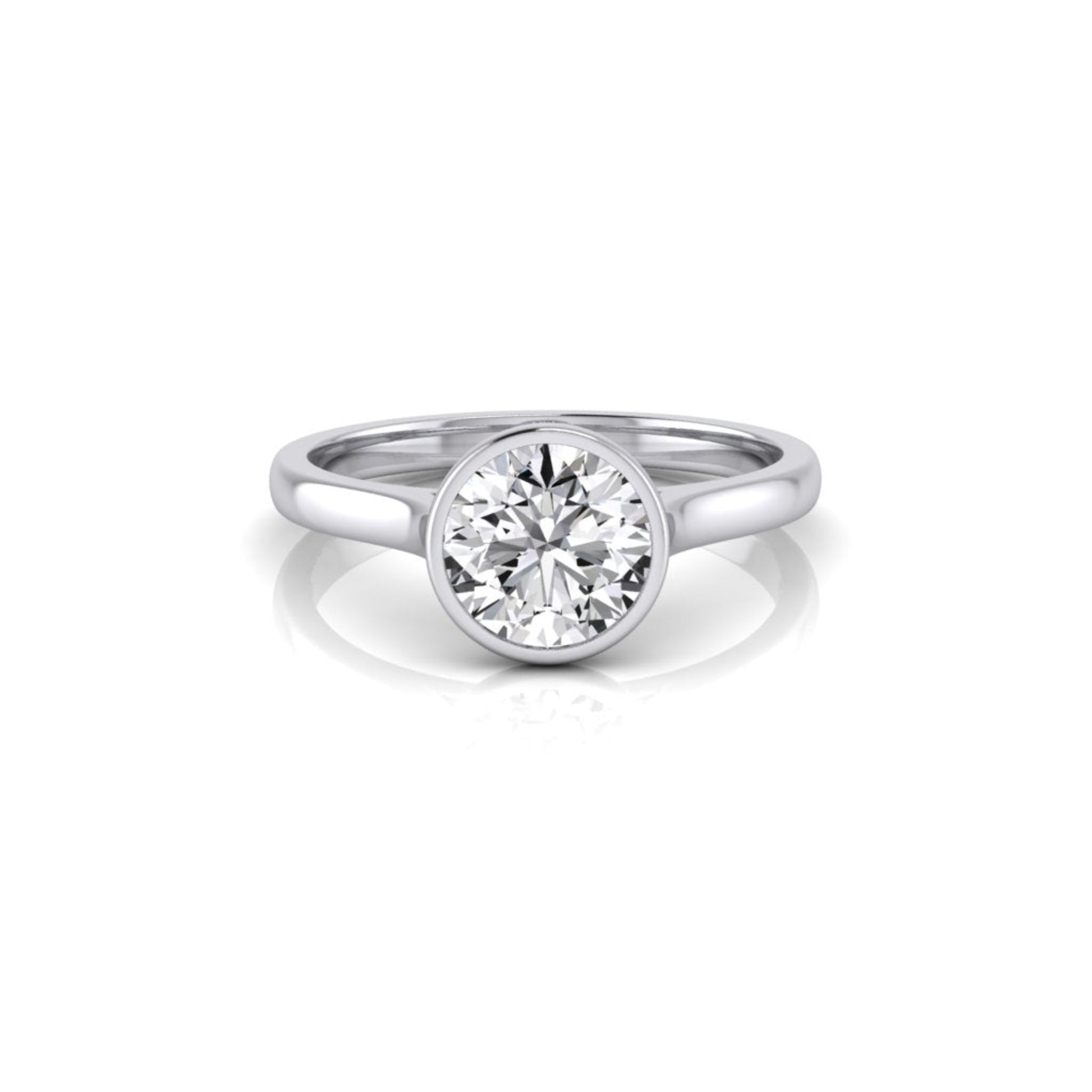 The Anne Bezel Solitaire Ring is a classic design featuring a round brilliant diamond encased in a sleek bezel setting.