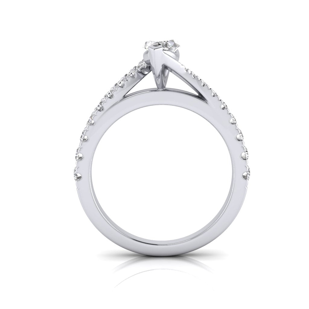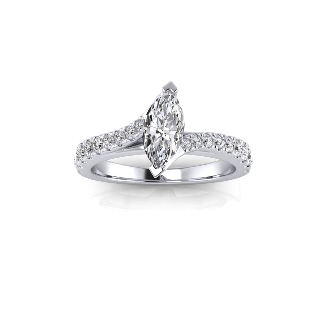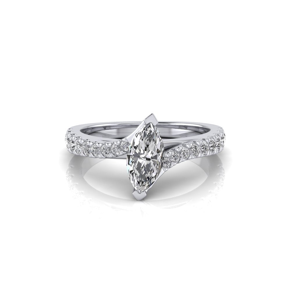The Daisy Marquise Ring features a natural marquise diamond as the centre stone, secured by V-end claws. The band features shoulder diamonds and an unique twist design.