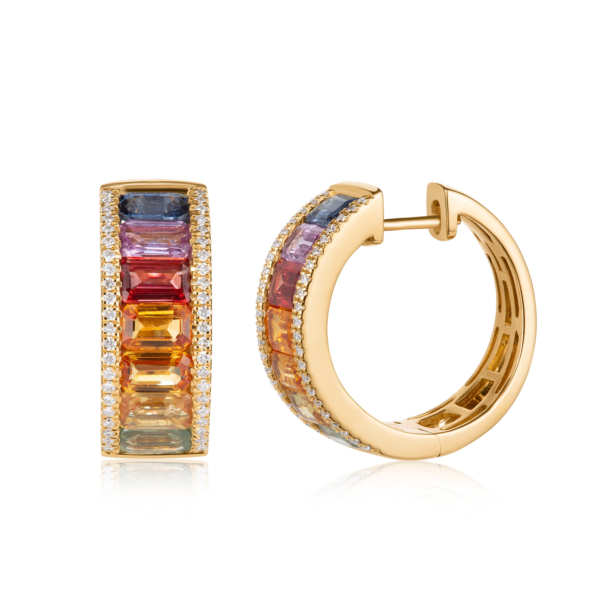 The Rainbow Sapphire Emerald Cut Hoops feature vibrant sapphires in every colour of the rainbow. These sapphires are surrounded by a dazzling halo of natural round brilliant diamonds, adding extra shimmer and elegance to this bold design. The radiant colours of the sapphires dance in the light, creating a fun, eye-catching effect that's impossible to ignore.